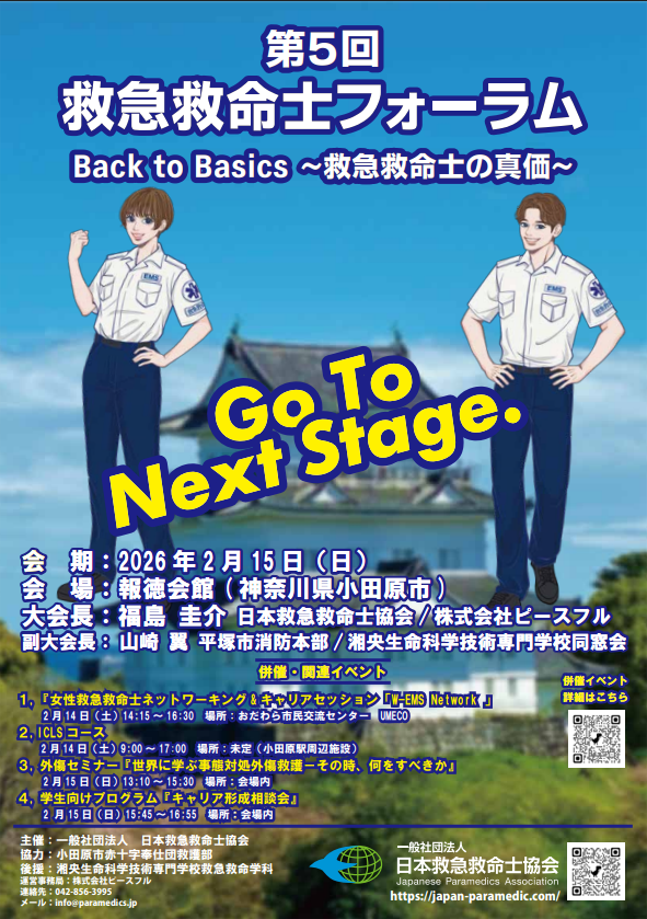 - 第3回救急救命士フォーラム ※終了しました2024年3月17日(日)第3回救急救命士フォーラム、多くの皆様にご参加頂き盛会のうちに終了いたしました。ご参加いただきました皆様方、関係各位のご協力に心より感謝申し上げます。 第3回救急救命士フォー… 続きを読む: 第3回救急救命士フォーラム ※終了しました
